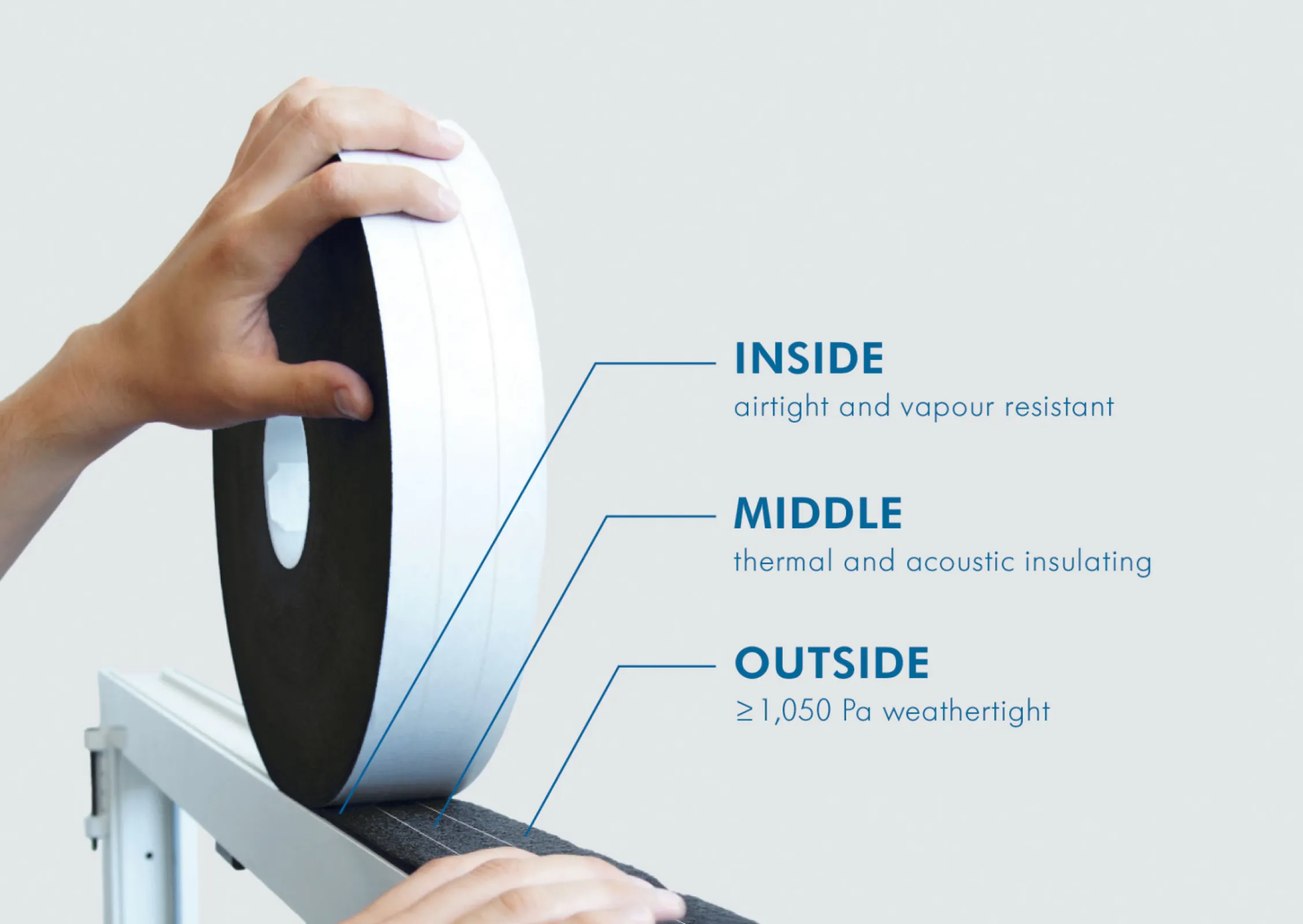 ISO-BLOCO HYBRATEC is a multi-functional tape 4.0 that is equipped with hybrid technology. The new hybrid technology combines the high resistance of film technology to air and driving rain with the reliable flexibility and movement absorption ability of high-quality multi-functional tapes tested and certified to MF 1 (previously BG 1 and BG R). With an a-value of 0.00 m³/[h·m·(daPa)2/3], the pre-compressed tape is 100 % air tight when used on the interior and thus prevents convection heat losses. By integrating several barrier layers, ISO-BLOCO HYBRATEC complies with the principle “inside tighter than outside”.